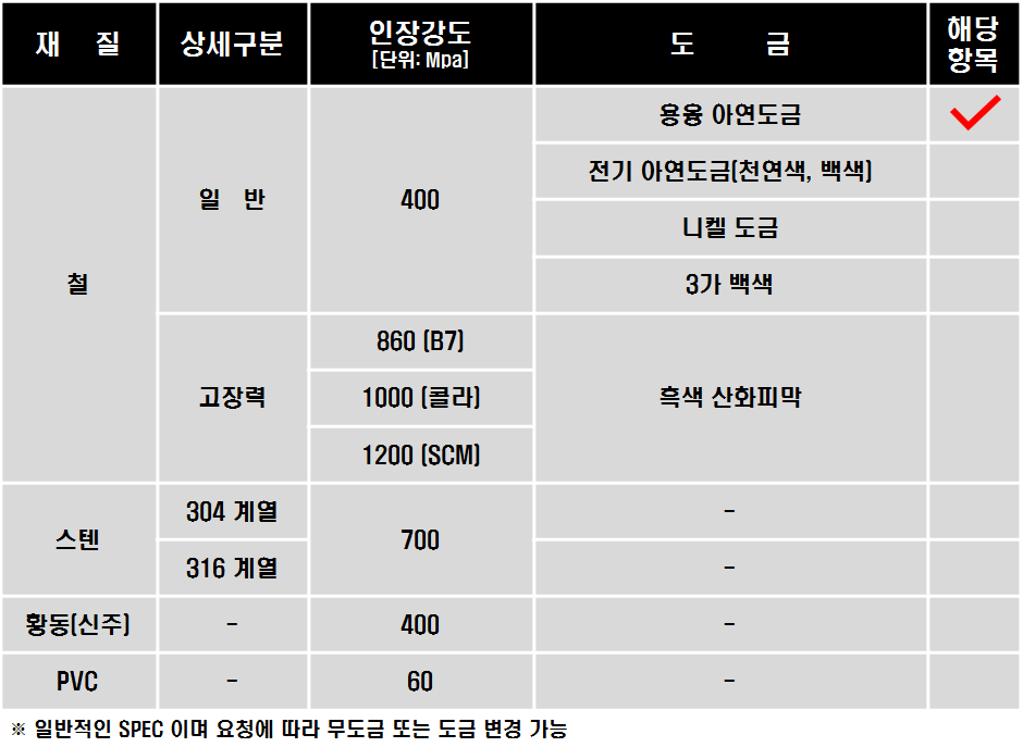 - 제품 요청은 품명,재질 및 "규격(볼트두께) x 길이" 로 문의 부탁드립니다.