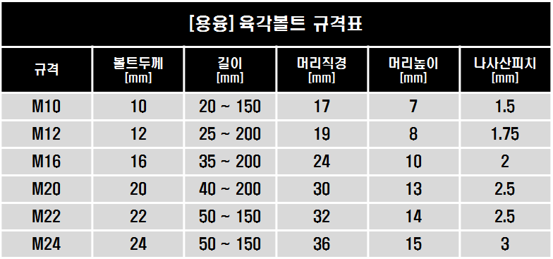 ※ 육각볼트의 "길이" 는 머리높이를 제외한 부분을 명명함