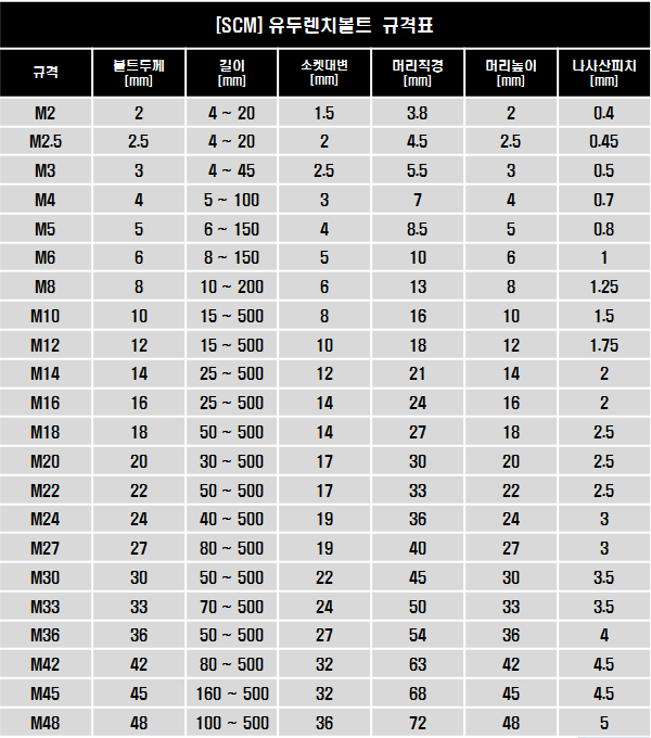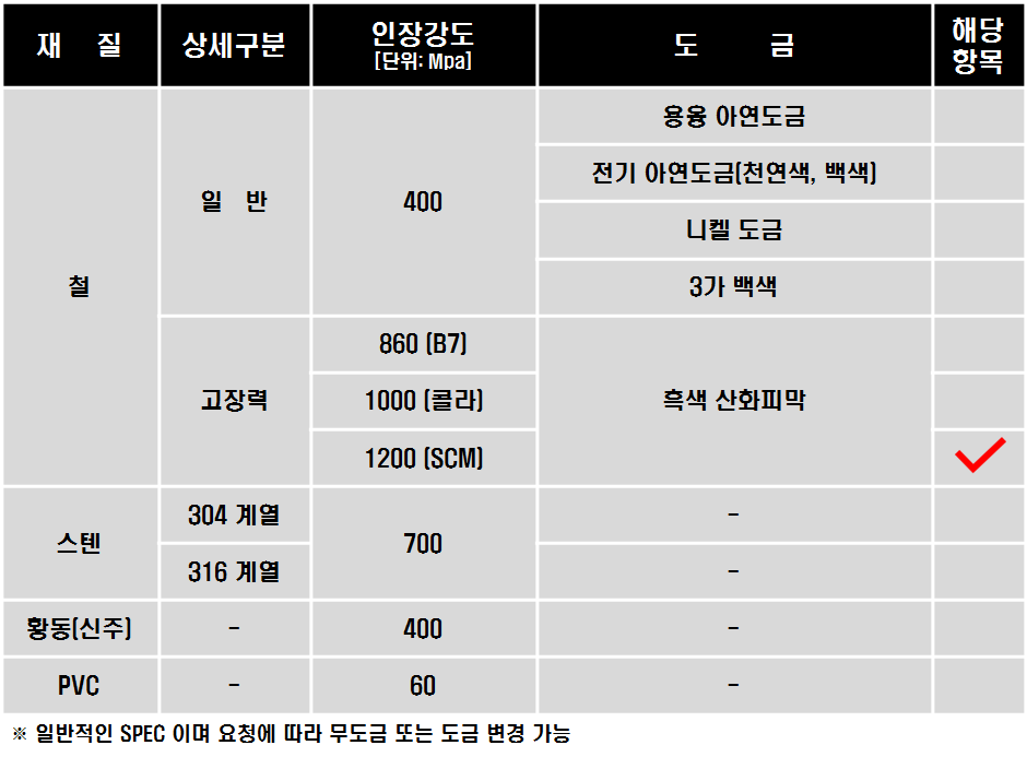 - 제품 요청은 품명,재질 및 "규격(볼트두께) x 길이" 로 문의 부탁드립니다.