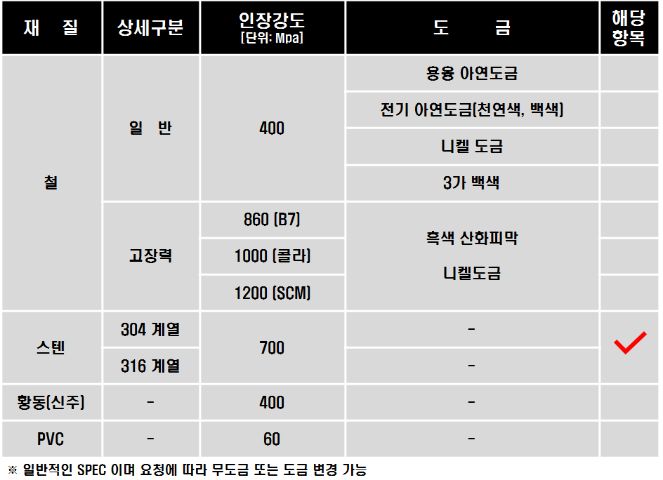- 제품 요청은 품명,재질 및 "규격(볼트두께) x 길이" 로 문의 부탁드립니다.
